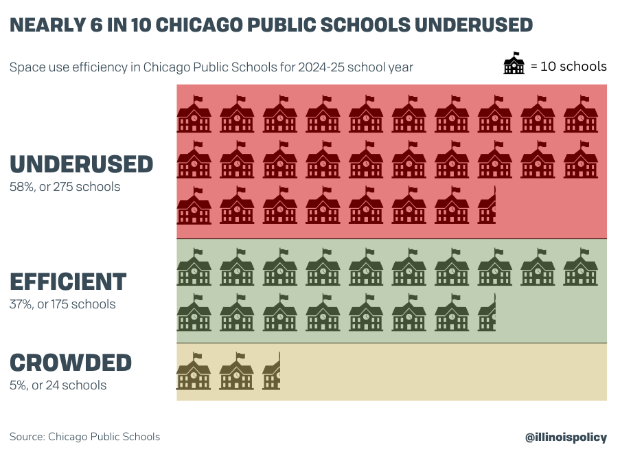 Data shows 58% of schools – or 275 school buildings – were underutilized, 37% were efficient and 5% were overcrowded in the 2024-2025 school year. The data reports on school buildings operated by CPS, excluding charter schools operated in their own buildings and alternative schools.