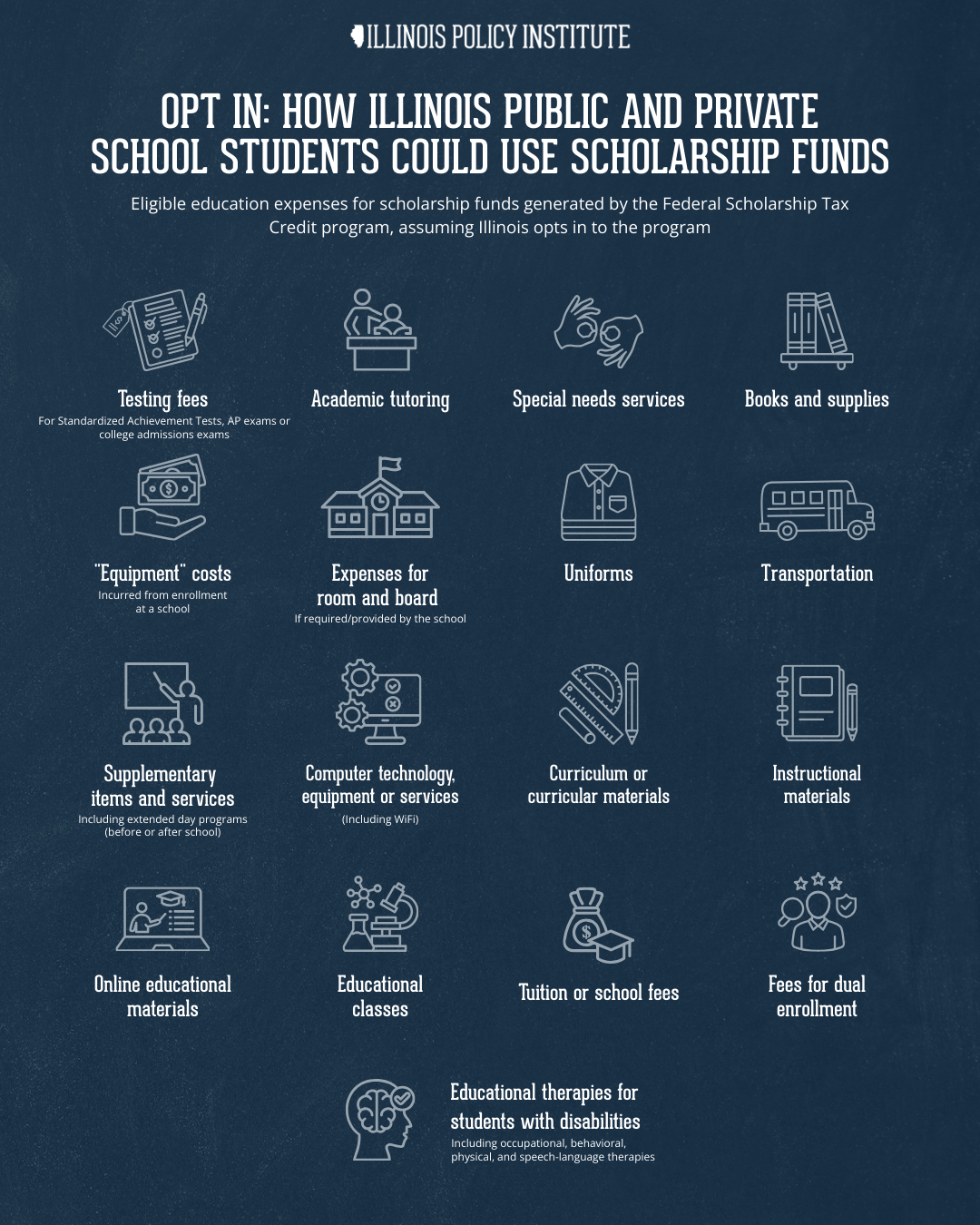 Imagine a third-grader struggling in math. If his household income is less than 300% of the median income in his area, he would qualify for donor money for tutoring or other academic services, whether he’s at a public school or a private school. But only if Illinois opts into the program.