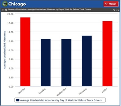 To see the impact of making this information public, we can look to the City of Chicago. In September 2011, Mayor Rahm Emanuel made news when he announced that an internal investigation foundalmost seven percent of the cityai??i??s garbage truck drivers were on sick leave on Fridays.
